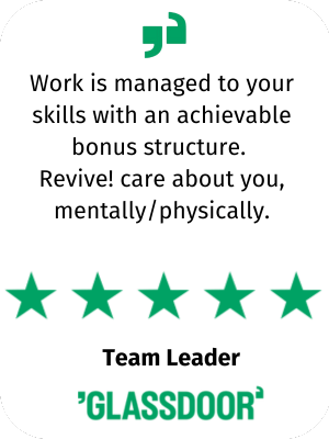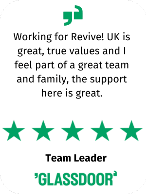 Revive!’s 4.4-star rating on Glassdoor is evidence of the company’s dedication to employee satisfaction. We are determined to ensure that not only our customers are happy, but our employees wellbeing is taken care of as well. Ensuring the hard work and positivity of the brand is carried forward is a responsibility of everyone employed at Revive! UK.